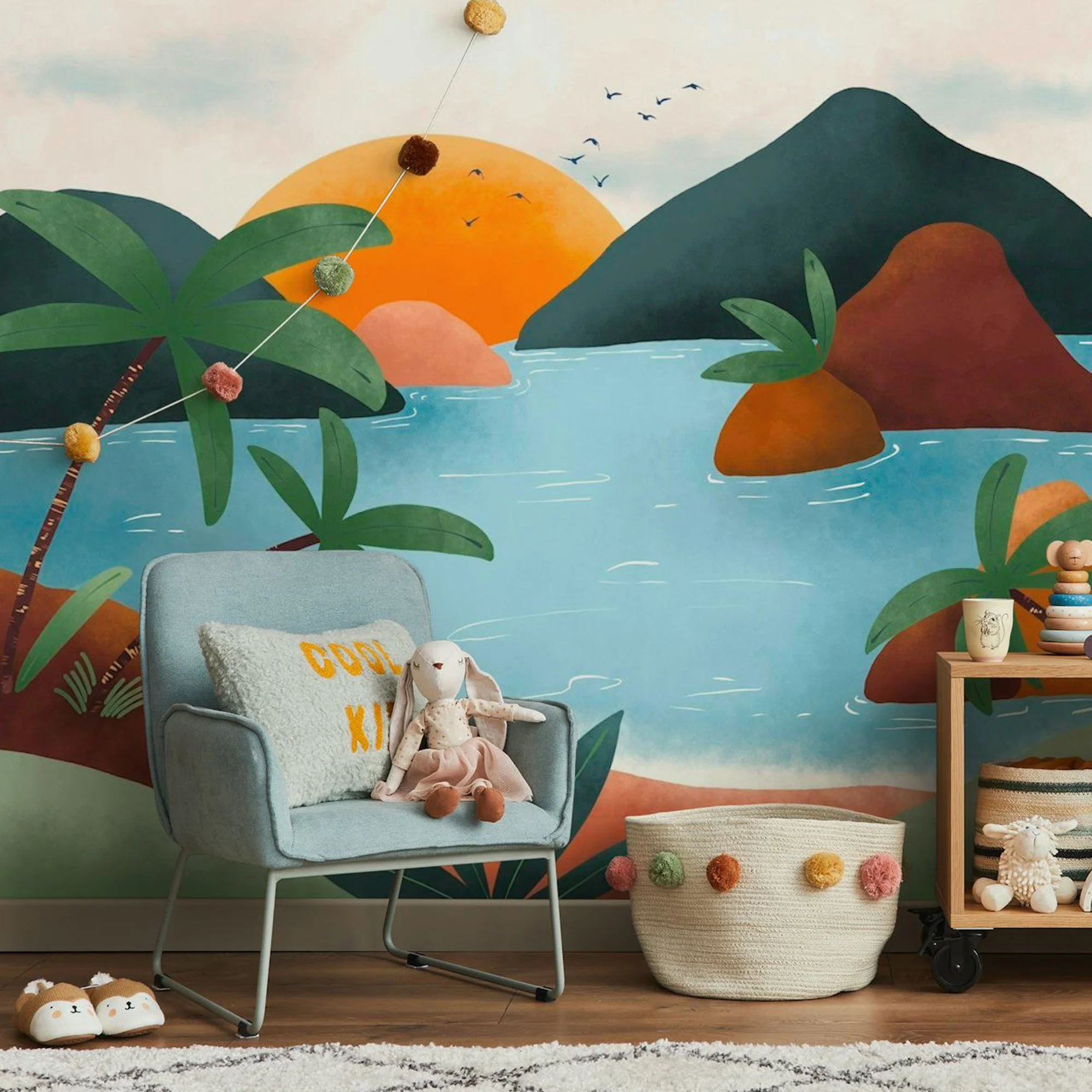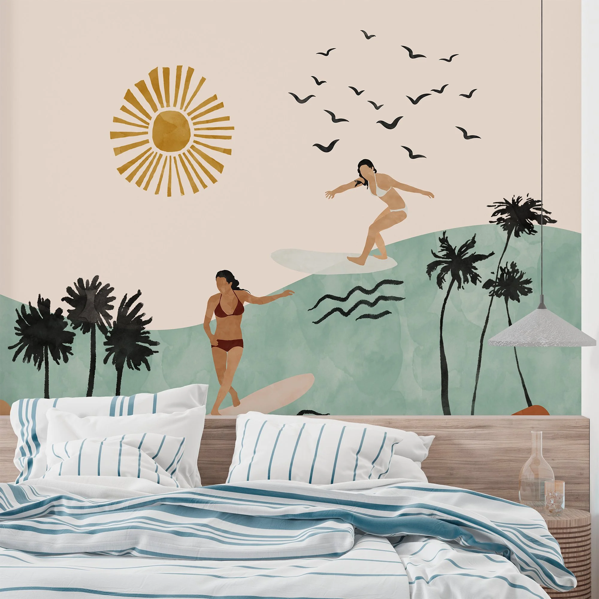 Transform your home into a tranquil sanctuary, where the whispers of nature and the beauty of the sunset come together in harmony, with a picturesque scene, adorned with tropical foliage, perfect for creating a peaceful retreat in your home or with a design that captures the essence of summer, with playful surfers, lush palm trees and a radiant sun.
